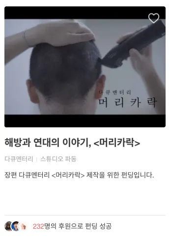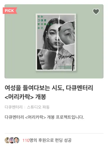 예를 들어 프로덕션 단계에서 크라우드 펀딩을 진행한 스튜디오 파동의 <머리카락>은 첫 번째 프로젝트를 통해서 모인 자금으로 다큐멘터리를 제작했습니다. 이후 완성된 작품의 개봉 및 배급 진행에 필요한 금액을 두 번째 프로젝트를 통해 추가 모금하였습니다.