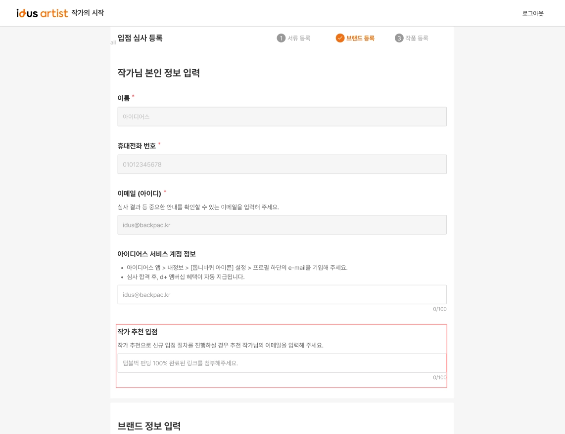 또한 입점 추천 작가 안내에 이메일 형식으로 입력하라는 가이드가 제공되지만 url 링크 제출해주시면 됩니다.