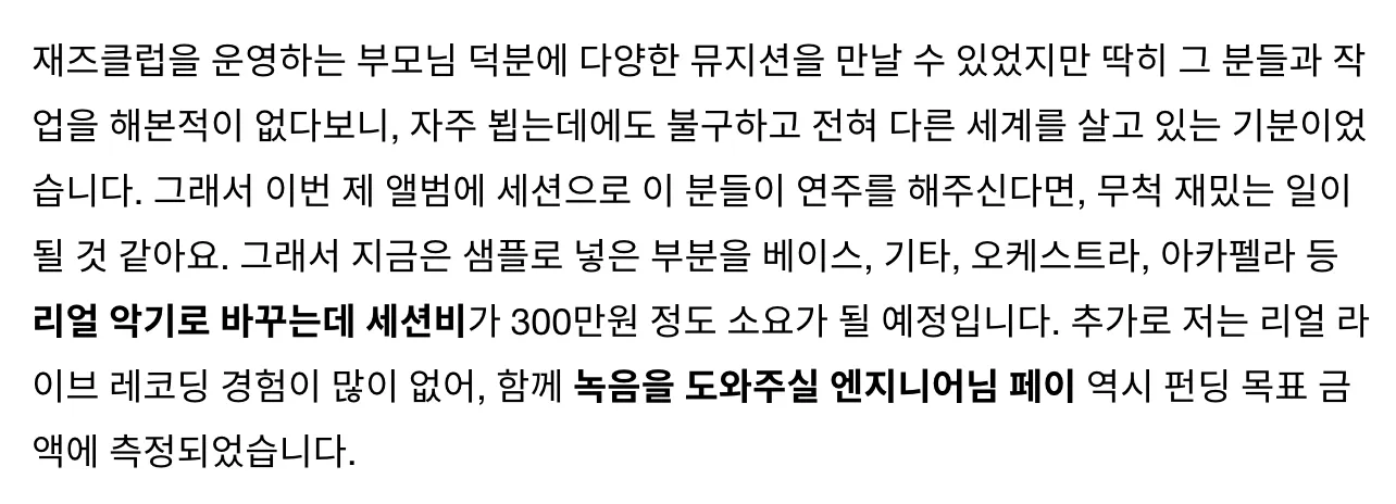 - 펀딩 종료 후 앞으로 제작이 필요한 단계와 진행 일정, 후원금 사용계획 밝히기 (ex. 스튜디오 녹음, 믹싱과 마스터링, 뮤직비디오 제작, 굿즈 제작 등)
