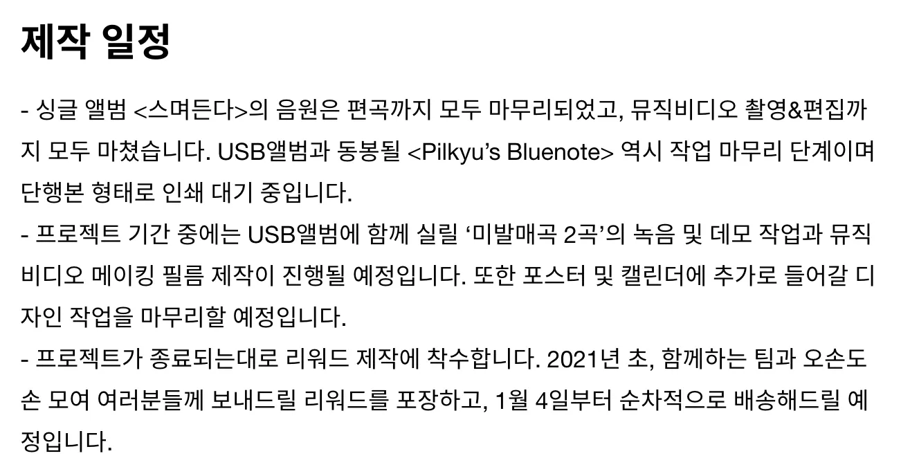 박필규의 9년만 첫 앨범 제작 펀딩에 기재된 제작 일정 내용