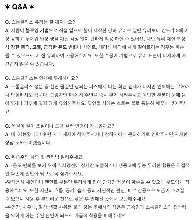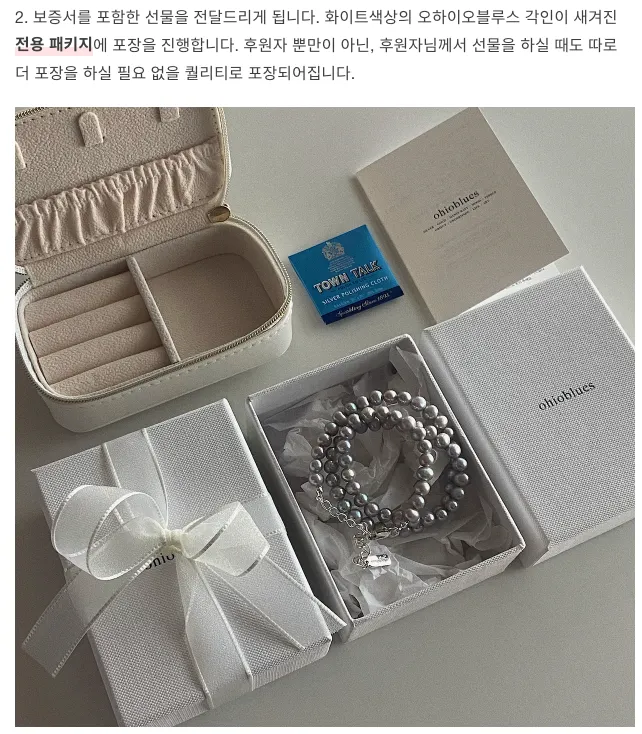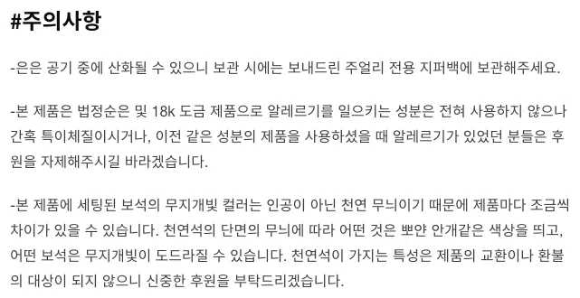 주얼리는 소재에 따라 변색이 되는 경우도 많지요. 후원자가 어떻게 주얼리를 보관하고 관리해야 하는지 방법을 알려주세요. 특히 후원자가 잘못 사용하는 경우가 발생하지 않도록 하면 안 되는 사항을 같이 알려주시면 더욱 좋습니다.