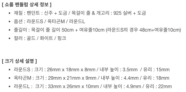 팬던트 사이즈, 체인 길이, 반지 호수 등 주얼리의 구체적인 사이즈와 소재정보를 알려주세요. 후원자가 좀 더 쉽게 후원을 결정할 수 있도록 사이즈 측정 방법을 함께 안내해 주시면 더욱 좋습니다.