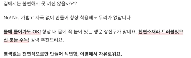 자칫 소재의 좋은 퀄리티를 강조하다보면 소재의 특성을 과장되게 설명하시는 경우가 있습니다. 합성석과 천연석을 동일하게 표기하는 등 후원자가 오인할 수 있는 설명은 지양해 주세요.