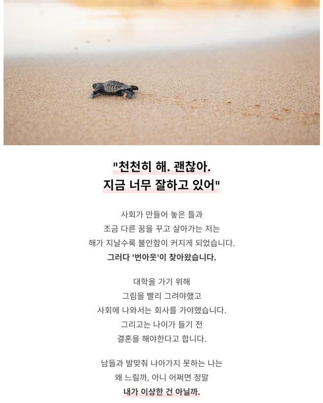 텀블벅 상세페이지에는 설명해야 하는 정보가 많은 만큼, 본문 시작 단계에서 먼저 후킹 포인트를 강조해야 후원자에게 내 프로젝트를 후원해야 하는 이유를 설득할 수 있습니다. 이때 소제목이나 이미지를 활용하시면 가독성을 높여서 후킹 포인트를 더 빠르게 후원자에게 인지시킬 수 있습니다.