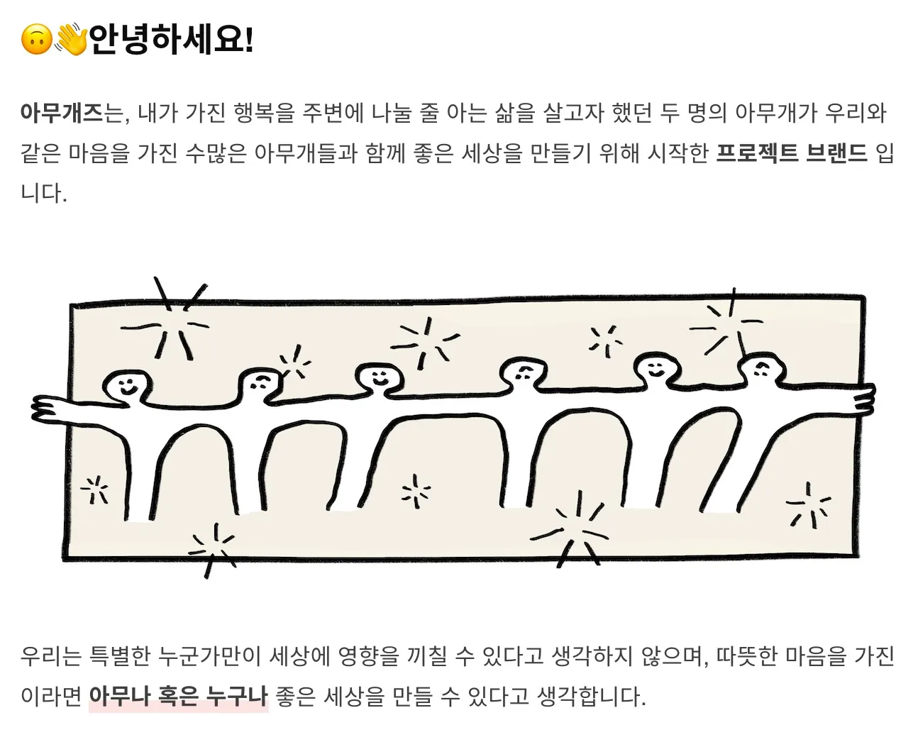 아무개즈는 특별한 누군가가 아닌 따뜻한 마음을 가진 이라면 아무나 혹은 누구나 좋은 세상을 만들 수 있다는 믿음으로, 2021년 12월 텀블벅 펀딩을 통해 첫 발걸음을 내디딘 캐릭터 브랜드입니다.
