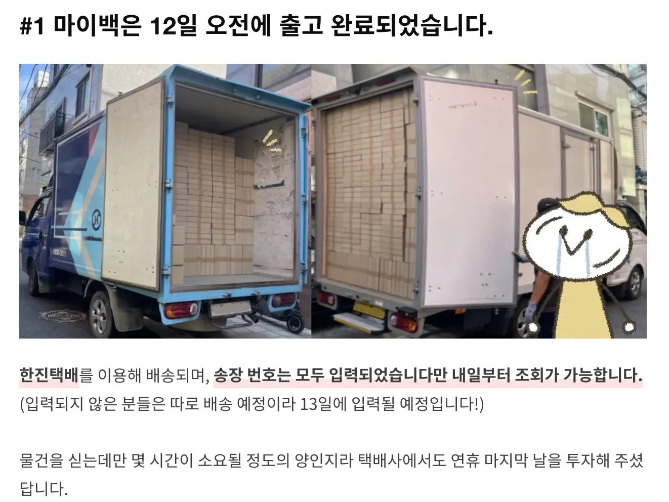 예상보다 제작 수량이 많아져 후원자님들께는 가능한 세세하게 진행상황을 공유하려 했어요. 문제가 생길 것 같은 부분을 미리 공유하고 이미 발생한 문제라면 해결책을 제시했죠. 덕분에 예상치 못한 문제가 생겼을 때 이해받을 수 있었고, 선물 제작 기간 내내 따뜻한 격려와 응원을 받을 수 있었습니다. 후원자님들의 응원을 원동력으로 잘 끝마칠 수 있었던 것 같아요.