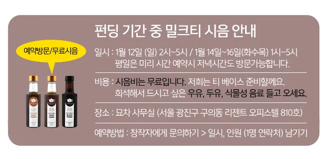 먹고 마시는 푸드 카테고리도 시음 및 시식회가 효과적인 분야입니다. 아무리 글로 잘 표현하더라도 직접 먹어본 만 못하죠. 묘차 창작자는 펀딩 기간 중 500% 달성 기념으로 시음회를 열었습니다. 시음회에서 묘차를 체험해 본 후원자들이 긍정적인 댓글을 남겨주었고, 주변에 묘차를 적극적으로 알리기 시작하면서 자발적인 홍보로 이어졌습니다.