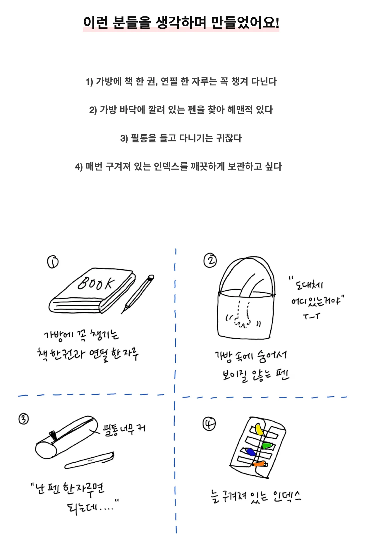 최상단의 직관적인 시각 자료로 흥미를 끌었다면, 다음은 이 제품이 필요한 순간, 공감할만한 구체적인 상황을 제시해주세요. 막막하다면 창작자님이 이 제품을 만들기로 결심한 순간, 프로젝트를 시작한 순간을 떠올려보세요. (주변의 가까운 누군가의 편의를 위해, 시중의 제품은 맘에 쏙 들지 않아서 등등.)