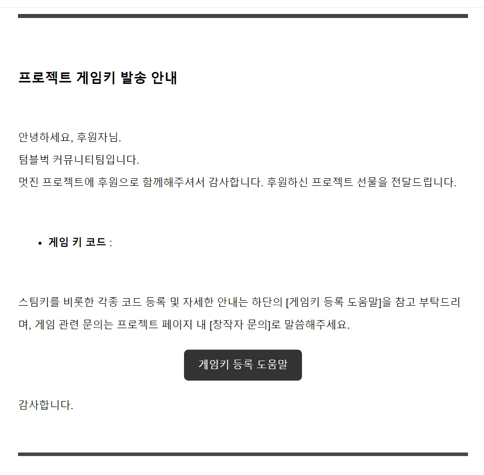 ※ 전달해주신 디지털 리워드는 전달해주신 게임 키는 후원자 계정에 등록된 이메일을 통해 전달됩니다.
