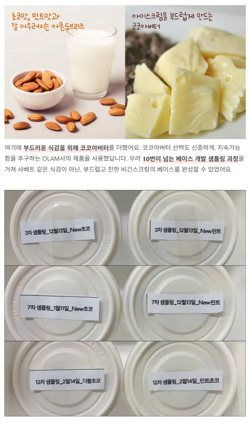 를 더했어요. 코코아버터 선택도 신중하게, 지속가능함을 추구하는 OLAM사의 제품을 사용했답니다. 무려 10번이 넘는 베이스 개발 샘플링 과정을 거쳐 샤베트 같은 식감이 아닌, 부드럽고 진한 비긴스크림의 베이스를 완성할 수 있었어요.