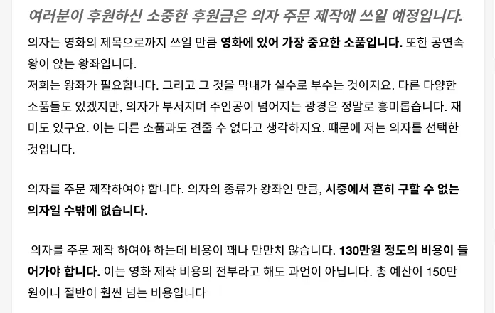 예를 들어 작품에서 가장 중요한 소품이지만, 그 특정 소품을 공수하는데 필요한 예산이 전체 예상 제작비의 과반수를 차지하고 있다면 그 비용을 목표 금액으로 잡은 프로젝트를 진행해도 됩니다. 왕좌를 제작하는데 필요한 130만원을 위해 크라우드 펀딩을 연 이 프로젝트처럼요.