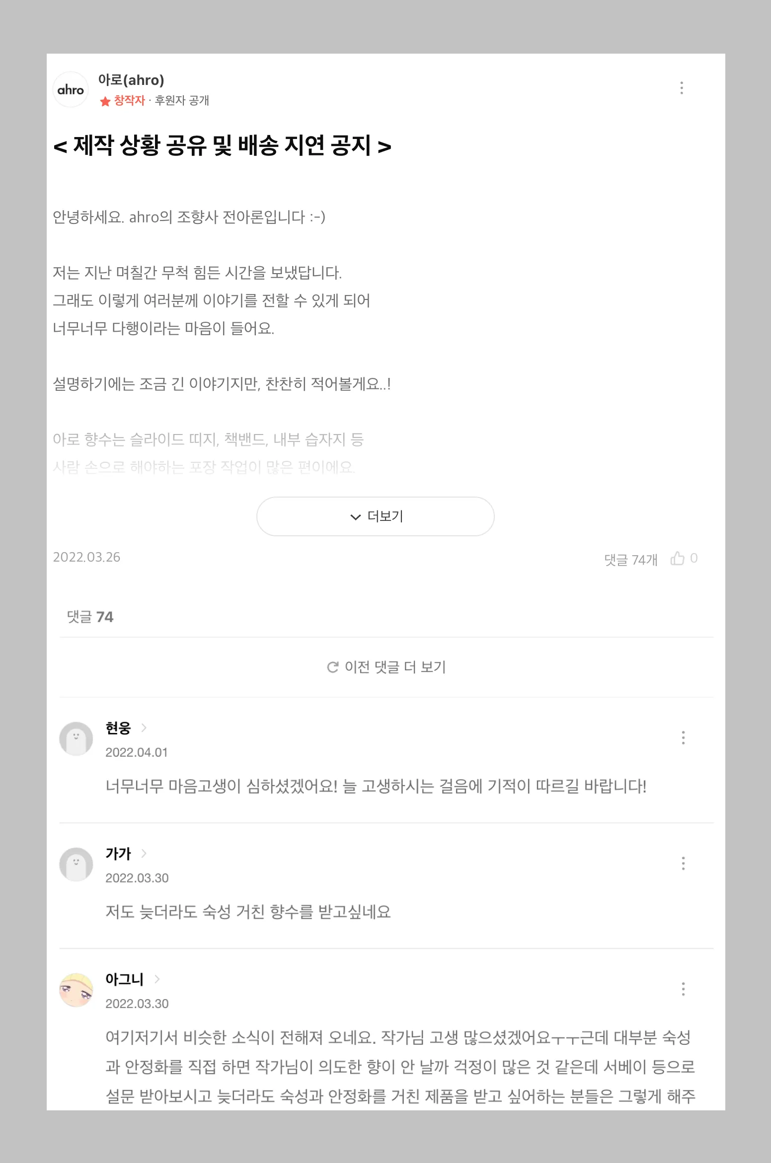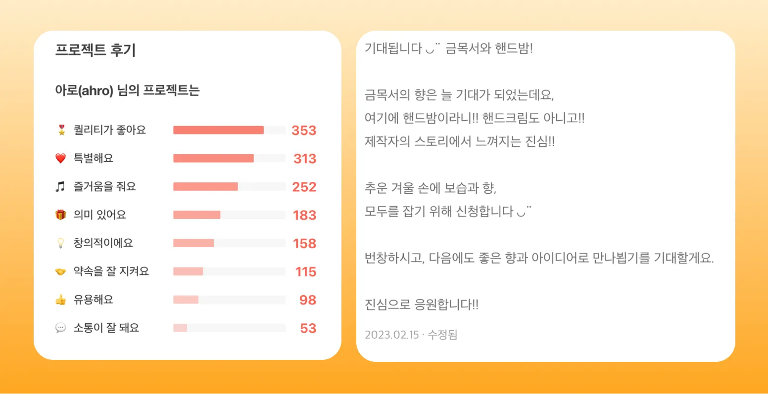 꾸준히 펀딩을 이어오면서 아로를 믿고 찾아주시는 후원자분들도 계속 늘어났어요. ‘어떤 향을 좋아해서' 후원을 하시는 게 아니라 ‘아로가 만든 향이라서' 후원해주시는 분들도 많았죠. 펀딩을 통해 믿고 후원하는 아로의 소중한 고객분들을 만날 수 있었어요.