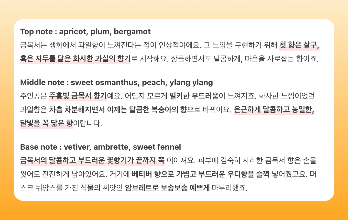 주변 사람들에게도 많이 질문해보세요! 조향사는 자신의 향에 대해 다르게 생각하기 어렵고, 더 풍부한 표현을 끌어내려면 여러 사람에게 이야기를 들어보는 게 많은 도움이 되더라고요.