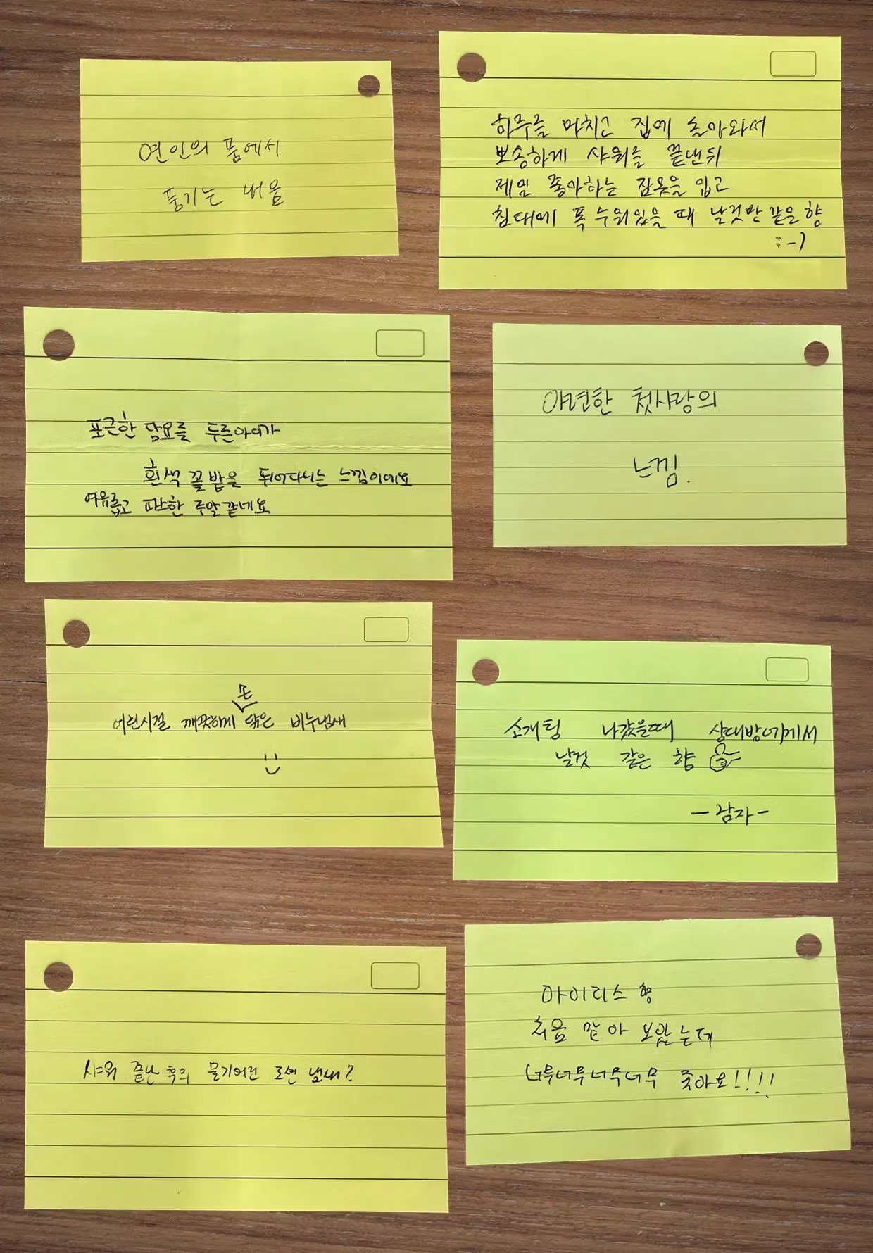만약 펀딩을 준비하고 계시다면? 급하게 쓰려고 마세요. 당장 눈 앞에 닥친 과제처럼 해내려고 하면 아무 것도 안 나와요. 향을 만드는 과정 사이사이에 계속 표현을 쌓아가고 만들어보세요. 조향 과정 속에서 향을 둘러싼 표현을 차근히 만들어가시는 걸 추천드려요.