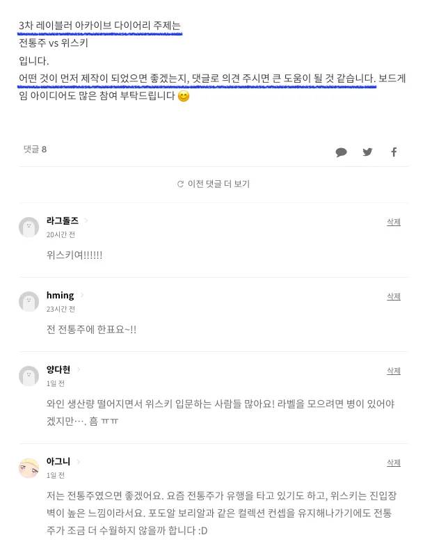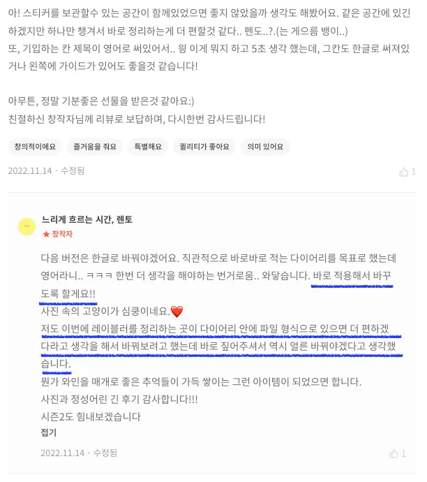 시즌 1 프로젝트로 처음 선보이는 와인 레이블러 다이어리와 라벨링 스티커를 후원하신 분들을 통해 얻은 피드백으로 제품을 발전시켜 최근 시즌2 펀딩까지 진행하셨고, 또 다음 프로젝트를 위해 의견을 구하기도 했습니다.