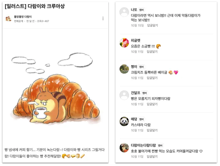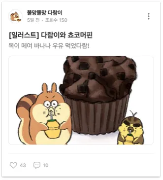 다람쥐를 좋아하지 않는 분이라도 이 캐릭터의 매력은 거부하실 수 없을 것 같아요. 소개해드릴 주인공은 바로 만화가 재수 작가의 ‘똘망똘망 다람이’랍니다! 작가님이 연애시절, 아내의 강요에 의해 만드신 캐릭터라고 하네요.
