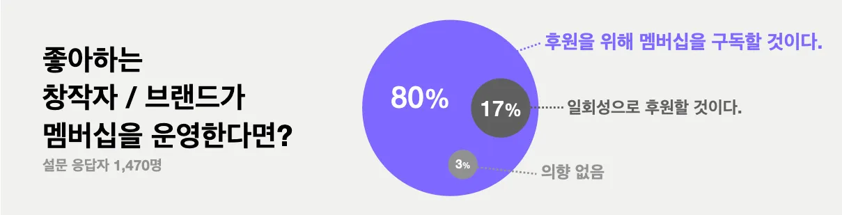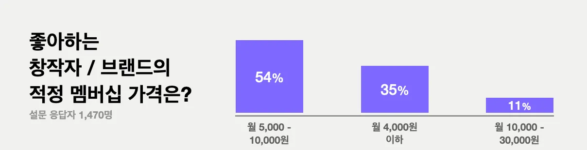 더불어 65% 이상이 창작자 혹은 브랜드 그 자체를 응원하기 위해 대가(멤버십 혜택)와 상관없이 구독 하겠다고 말씀해주셨어요. 그리고 원하는 멤버십 혜택의 종류도 정말 다양했습니다.