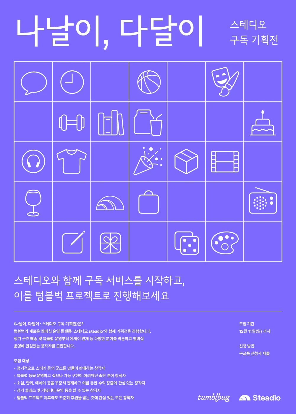 만약 12월과 1월 사이 텀블벅 펀딩을 고려하셨다면 리워드로 ‘스테디오 멤버십 쿠폰’을 추가 구성해보실 것을 추천드립니다. 펀딩을 고려하지 않으셨더라도 스테디오 운영 자체를 텀블벅 펀딩으로 진행하고, 리워드로 멤버십 쿠폰을 제공하시는 것도 좋을 것 같습니다.