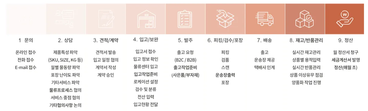 상담, 견적, 계약을 통해 합의된 절차에 따라 물류 대행 서비스를 이행합니다.