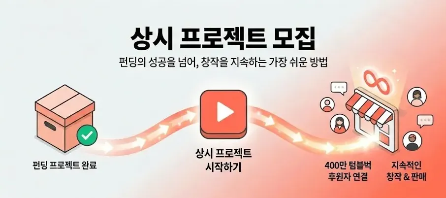 ‘상시 프로젝트’는 펀딩 종료 후에도 텀블벅에서 판매를 계속 이어갈 수 있는 서비스입니다. 펀딩으로 프로젝트의 시작 자금을 마련했다면, 이제 상시 프로젝트로 후원자와의 연결을 끊김 없이 이어가세요. 창작의 시작도, 지속도 텀블벅에서 가능합니다.