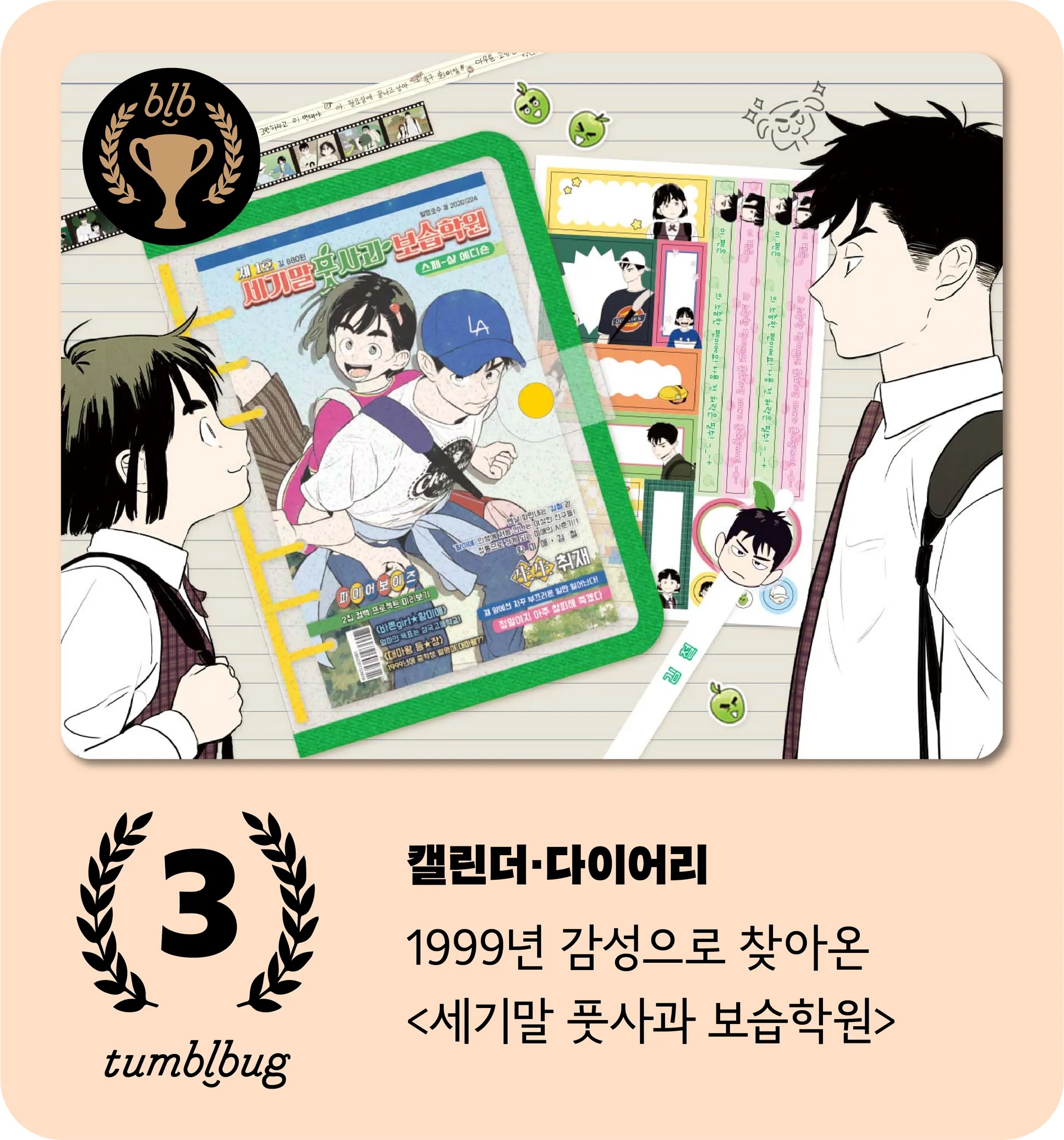 네이버 웹툰의 <세기말 풋사과 보습학원>이 두번째 펀딩으로 찾아왔습니다. 이 역시도 작품의 주인공인 ‘미애’의 가방에 늘 담겨있는 다이어리를 실물로 구현한 프로젝트 입니다. 표지부터 속지까지 레트로 감성이 가득 담긴 고퀄리티 굿즈로 소장 욕구를 자극하였죠.