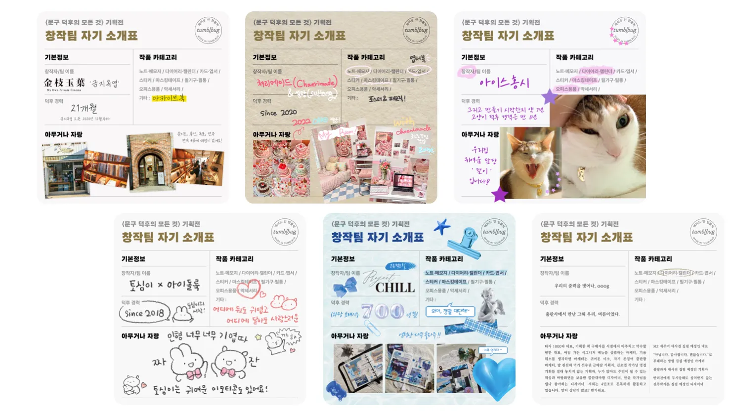 <문구 덕후의 모든 것> 기획전에서는 ‘자기 소개표’를 만들어 페이지에 소개하는 미션이 있었는데요, 자신의 ‘덕후 경력’도 소개하고 ‘아무거나 자랑하기’를 통해 제품과 프로젝트에 얼마나 애정이 있는지 엿볼 수 있었던 재밌는 기회였습니다.