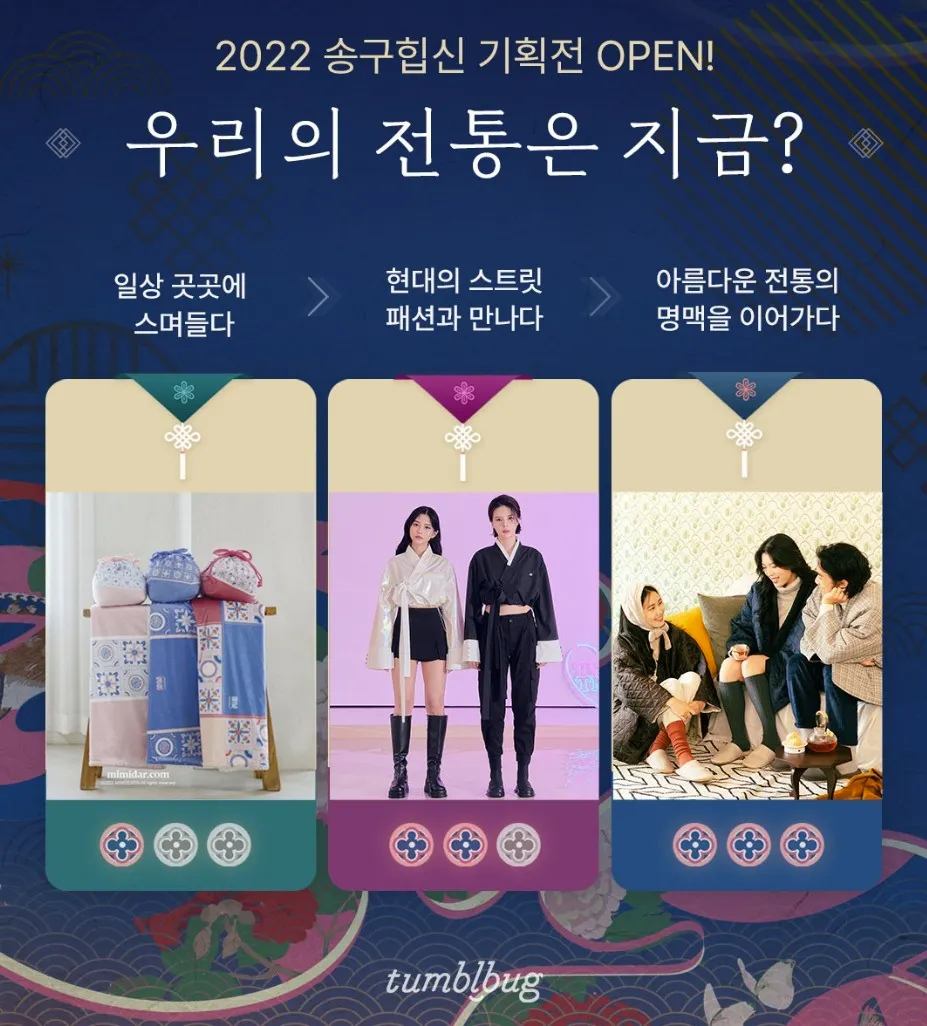 항상 아쉬워만 하다가 올해는 텀블벅에 합류하고 텀블벅에는 저와 같이 한복과 전통을 사랑하는 분들이 많이 있다는 것을 알게 되었어요. 상반기에도 이미 송구힙신 기획전이 성공적으로 열린 적도 있고, 하반기에도 그 계승을 이어야겠다고 생각하며 텀블벅의 축제처럼 기획해 진행하게 되었어요!