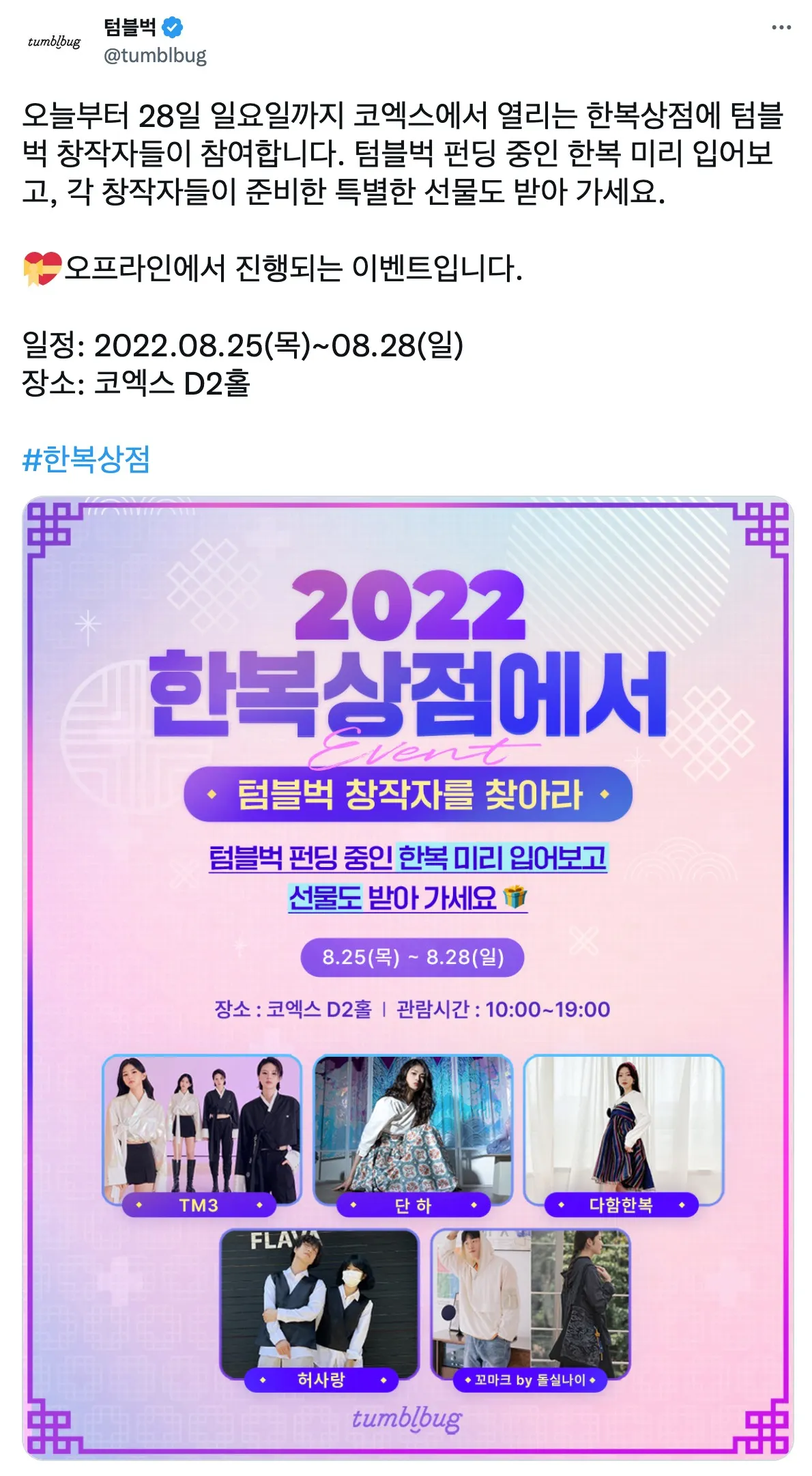 텀블벅 트위터에 게시된 한복상점 시착 이벤트 홍보
