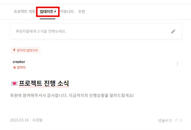 후원자가 설정에서 텀블벅 메시지 수신 시 메일 알림을 받는 설정을 꺼 두었을 수 있으니, 중요 공지는 업데이트 기능을 이용해주세요!
