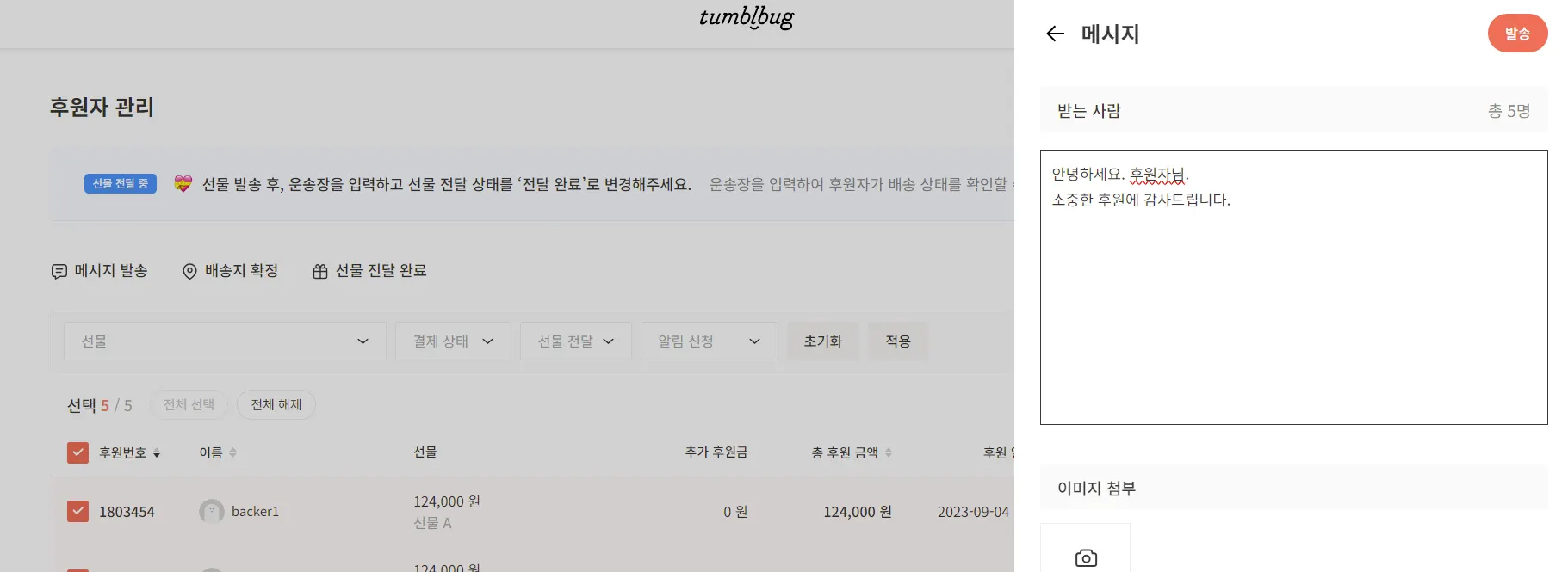 프로젝트 관리 > 후원자 관리 페이지에서 메시지를 발송하실 수 있습니다. 후원자에게 메시지 도착을 알리는 알림이 함께 발송됩니다. *앱 푸시 및 카카오 알림톡