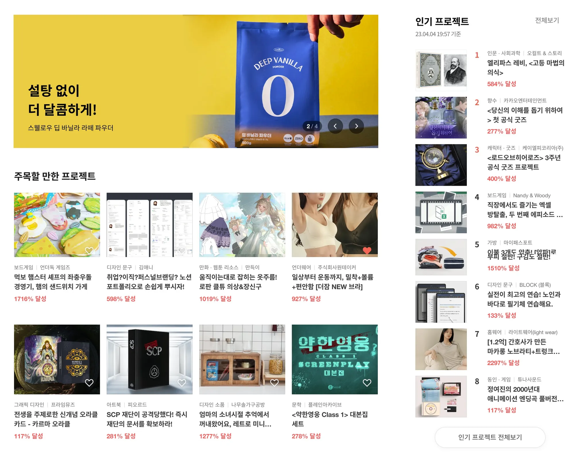 다양한 장르의 프로젝트가 한데 노출되는 텀블벅 메인 페이지
