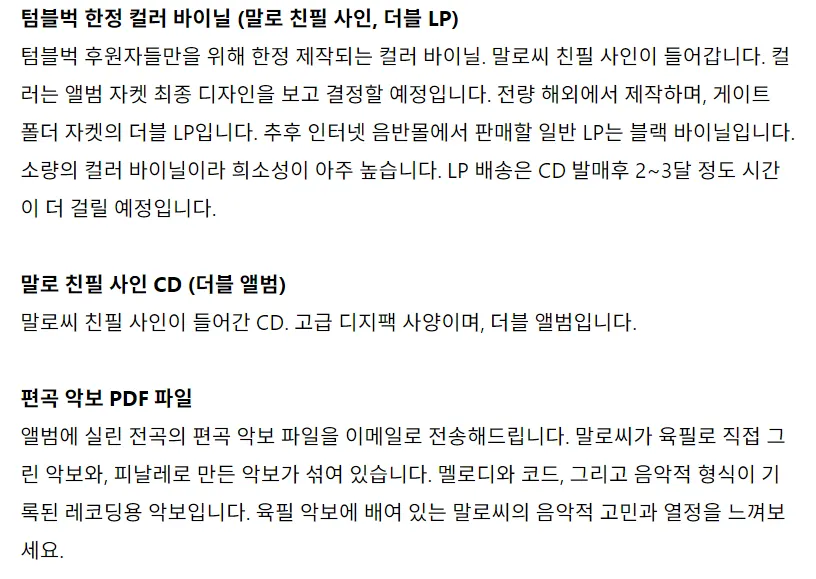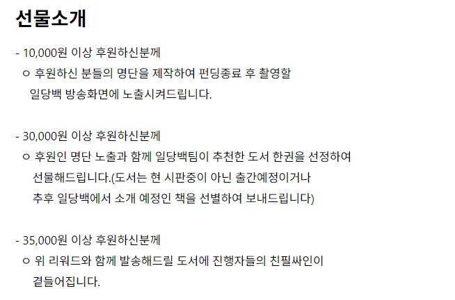 후원자들에게 제공할 후원 선물을 하나하나 소개해주세요. 프로젝트의 결과로 만들어질 창작물과 더불어 텀블벅에서만 받을 수 있는 서비스를 조합해보세요. 꼭 제품이 아니더라도 후원자 명 기재, 친필 사인 등과 같은 서비스도 선물이 될 수 있습니다. 각각의 선물이 무엇인지, 그리고 언제, 어떤 방법으로 제공되는지 각각 소개해주세요.
