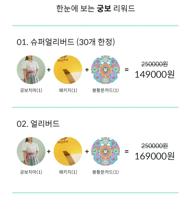 제공하는 선물이 많다면 도표를 활용해 한눈에 볼 수 있도록 하는 것도 좋은 방법입니다. 특히 한정 수량, 얼리버드 선물과 같이 추가적인 혜택이 있다면 이를 강조해서 소개해주세요.