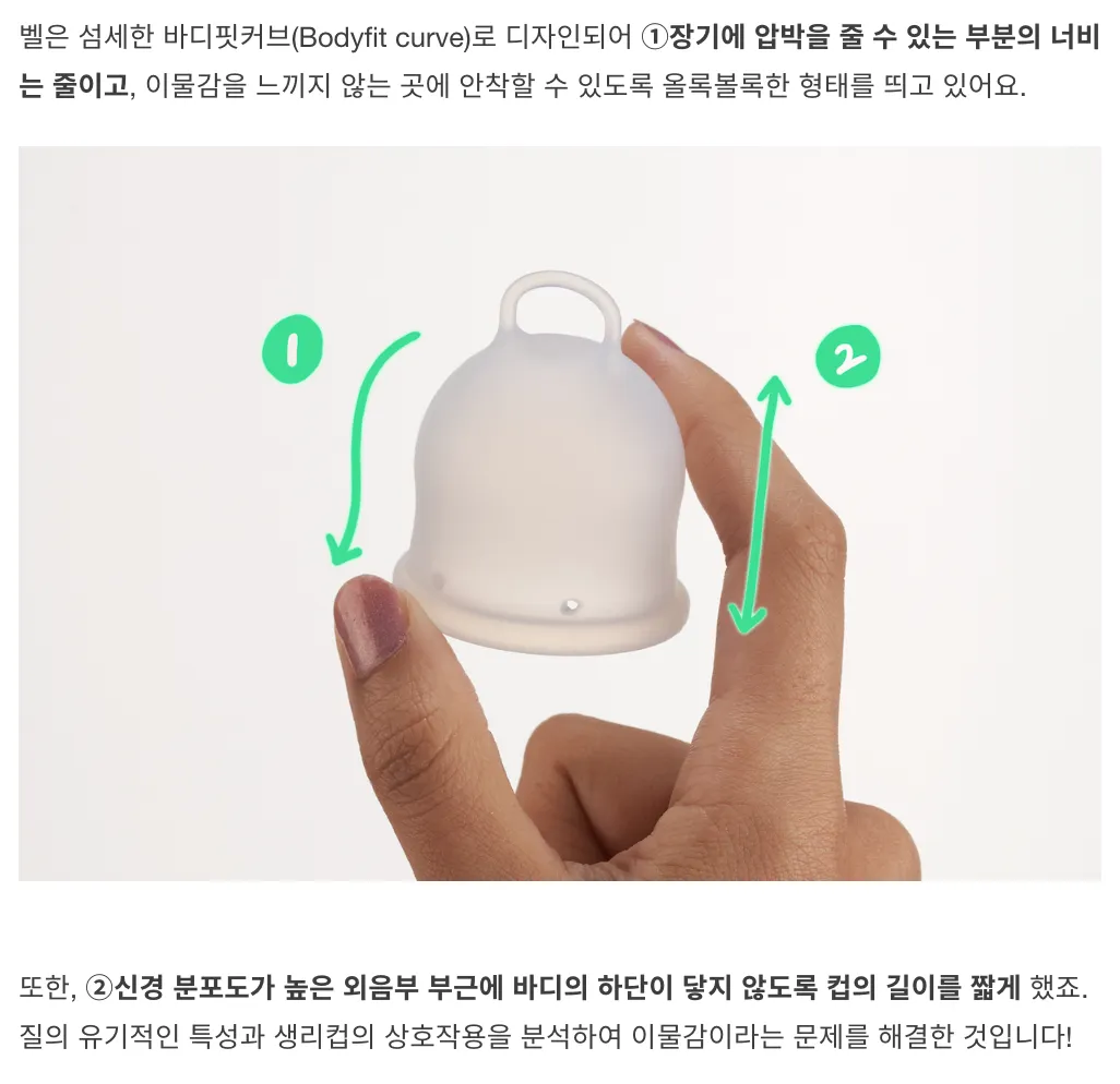 오이사 벨 생리컵 상세페이지 내용에서 디테일하게 설계된 제품 내용을 확인할 수 있다.