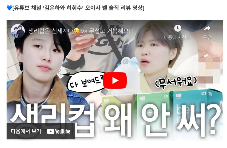 높이뛰기 선수로 활동하시는 분이 텀블벅에서 체험단(체험단 기획전 자세히 보기)으로 선정돼 후기를 남겨주셨어요. 훈련 중에 생리대나 탐폰 사용이 어려워서 생리컵을 사용하는데 기존 생리컵은 꼬리가 있고 뾰족해서 떨어질 때 위험했다고 하셔요. 근데 오이사 벨은 형태가 일단 짧고 고리가 딱 붙어있어서 걱정 없이 훈련을 하실 수 있었답니다.