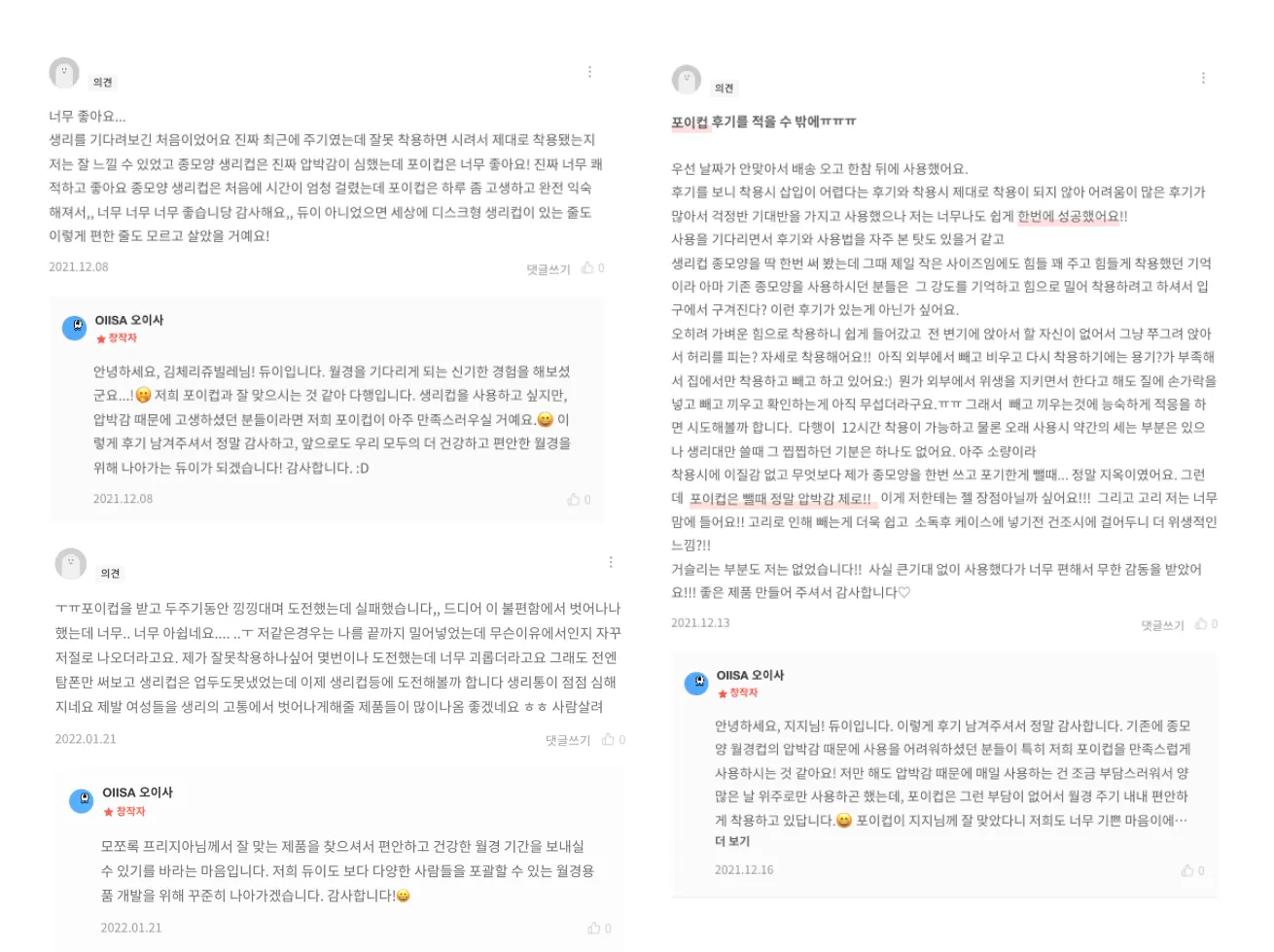 펀딩을 통해 생리디스크라는 제품은 어느 정도 적응 기간이 필요하고 상세한 가이드가 필요하다는 것을 받아들이게 되었던 것 같아요.