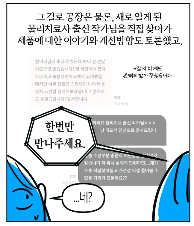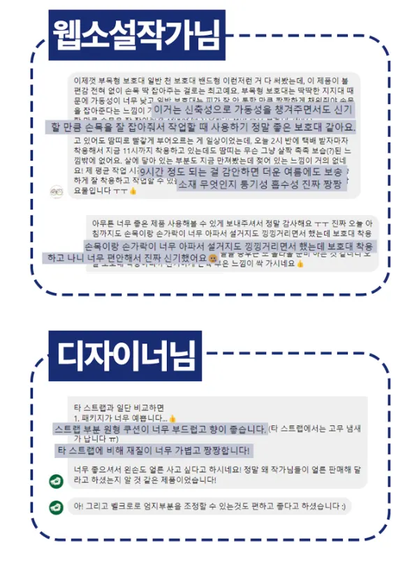 디앤엘 특히 첫 펀딩에서 물리치료사 출신 작가님이 계셨는데, 본인이 물리치료사 출신 작가인데 이런 부분은 좋았고 이런 부분은 안 좋았다 메시지를 주었어요. 그래서 직접 만나자 약속도 잡고 같이 제품 개선 방향도 진지하게 논의하며 친해졌어요. (웃음) 시즌 2 샘플도 만들자마자 작가님께 테스터로 보내드리고 후기도 받았는데 작가님께서 홍보까지 해주셔서 정말 감사했습니다.