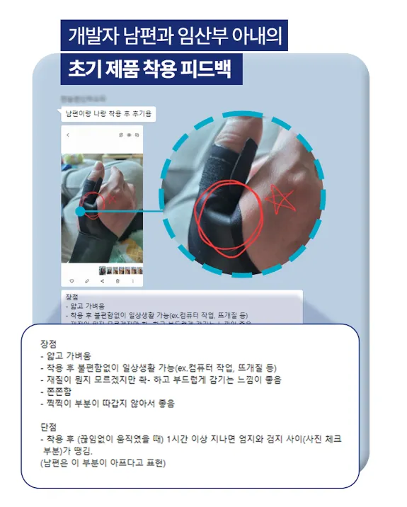 디앤엘 시즌 1에서 다양한 피드백들이 있었어요. 엄지가 걸려서 약간 불편하다, 사이즈가 다양했으면 좋겠다, 많이 움직이면 미끄러진다 등등. 후원자님들의 후기가 많은 도움이 되었죠. 의견을 남겨준 분들에게는 따로 메시지를 보내 직접 개선된 샘플을 보내기도 했습니다. 그리고 바로 샘플에 대한 피드백을 들어보고, 그럼 또다시 개선하고 또 샘플 보내고 또 테스트하고의 반복 과정을 거쳤어요.