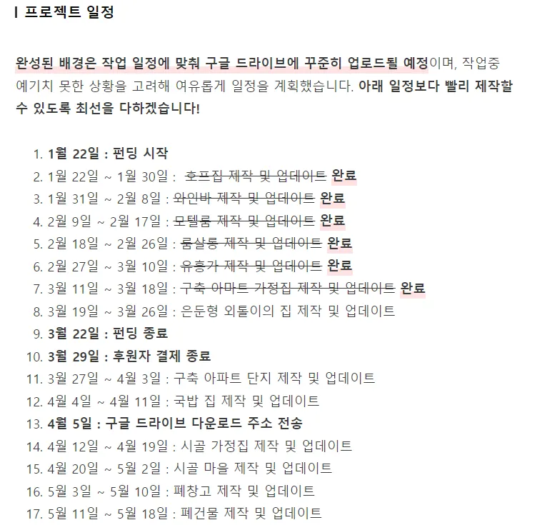 실내&야외 웹툰 배경 올인원 풀세트 20종 [일상/느와르] 프로젝트 진행 일정을 상세하게 작성하였다.