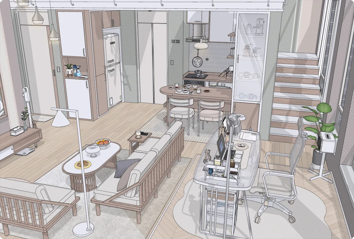 일비 스케치업 프로그램을 사용해 3D로 웹툰 배경을 만들고 있어요. 웹툰 작가님은 캐릭터와 구도, 분위기 연출 효과 등 그림만 그리기도 바쁘기 때문에 배경까지 신경 쓸 시간이 많이 부족해요. 작가님들이 최대한 배경에 손대지 않아도 될 만큼 만화에 가까운 배경을 만들고 있습니다.
