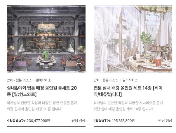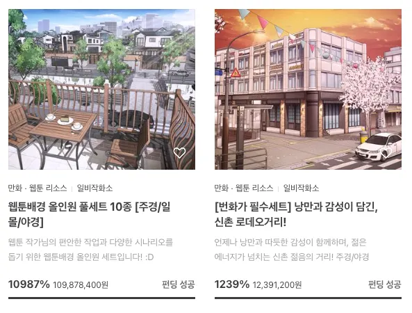 일비 후원 금액과 비중이 가장 높았던 리워드들은 기존 출시된 배경이 더해진 패키지 리워드였는데, 작가님들의 요청으로 생겨난 리워드였어요. 매년 새로운 웹툰 작품과 작가님들이 나오기 때문에 장르만 맞다면 지난 펀딩 배경도 계속 찾아주시더라고요.