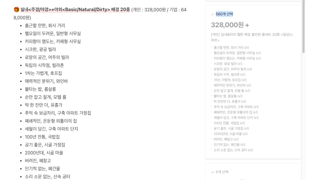 웹툰 배경은 다양한 장르와 씬에 반복 활용 가능한 멀티유즈 리소스가 반응이 좋습니다.