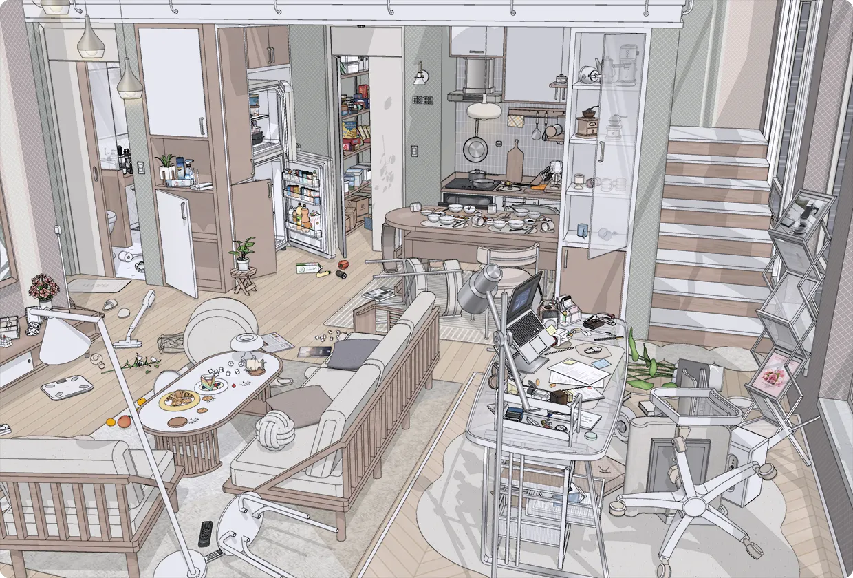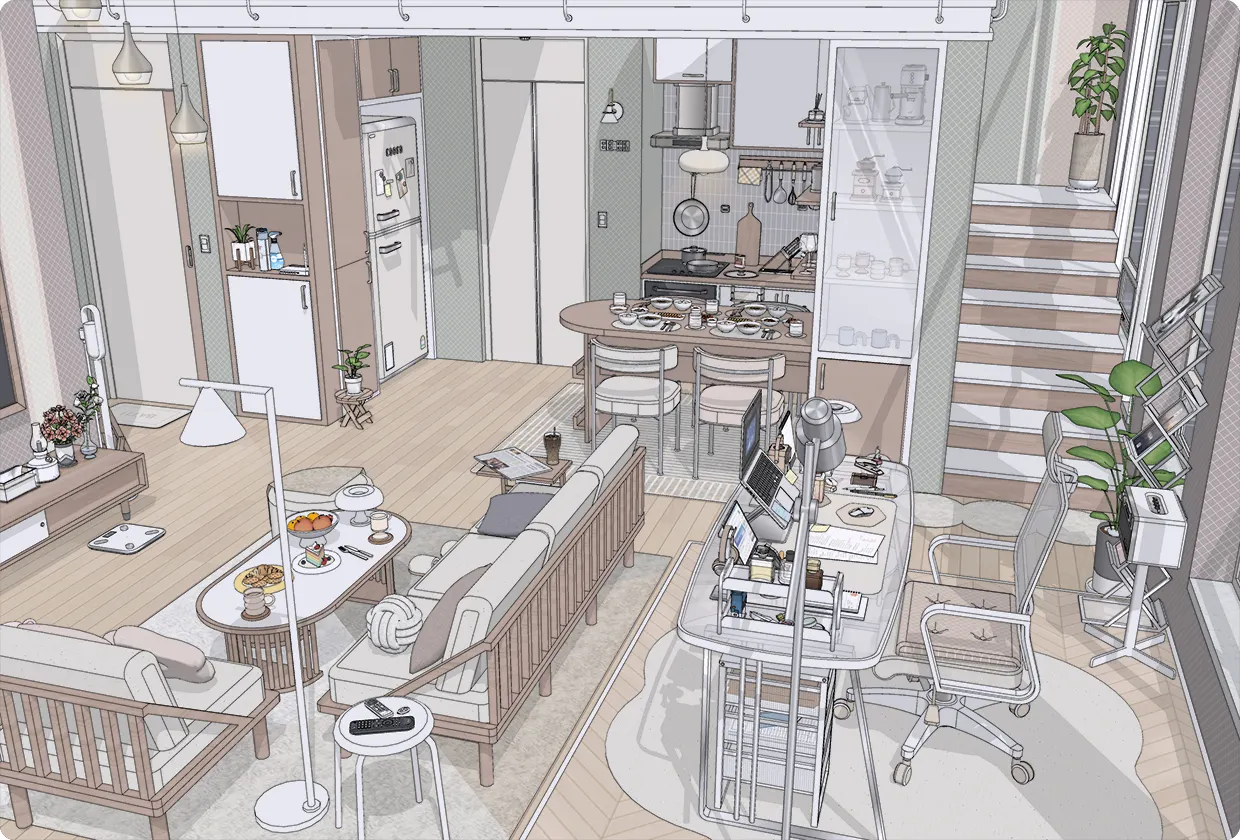 저희만의 차별점은 다양함이에요. 집을 예로 들면 깨끗한 집은 로맨스, 편안한 집은 일상, 더러운 집은 액션이나 공포 등 집 하나에도 연출과 스타일을 달리해 많은 장르와 이야기 소재를 담을 수 있죠. 또한 하나의 배경도 시간 흐름에 따라 다양한 연출이 가능해 작가님들의 다양한 니즈를 소화할 수 있습니다.